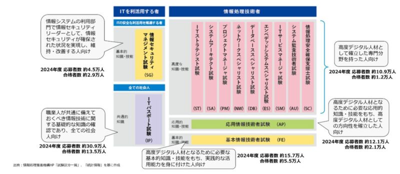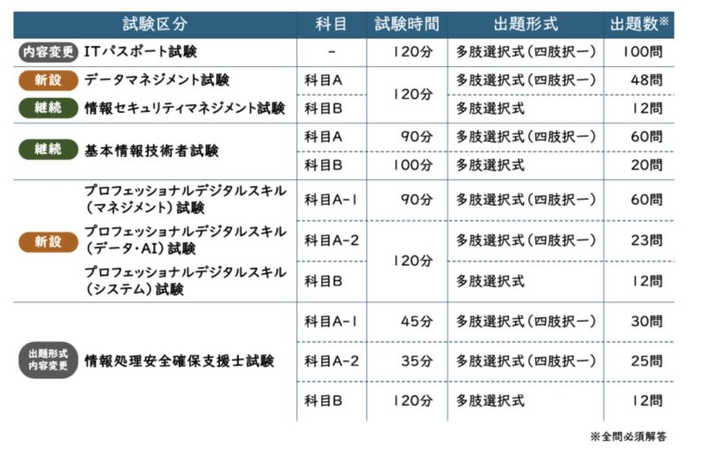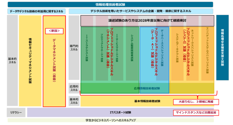 現行の「応用情報技術者試験」と「高度情報処理技術者試験」は終了となり、「プロフェッショナルデジタルスキル試験(仮称)」に統合・再編されます。