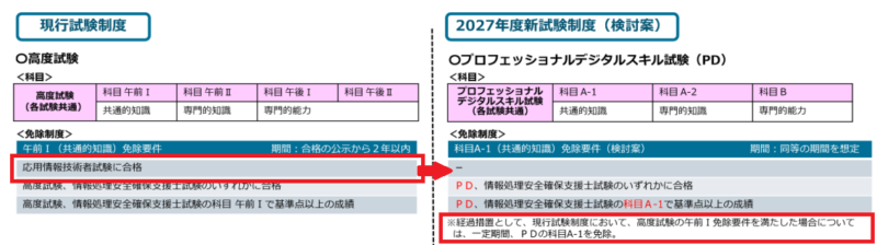 2027年度新試験精度の免除制度から応用情報が消えていましたが、下の方に注意書きで経過措置について書いてありました。