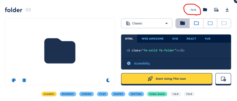 }アイコンはFontAwesome5を使用するので、公式サイトからコードを調べてください。